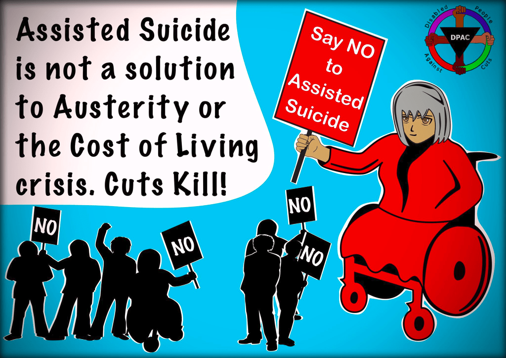 I stand with DPAC (Disabled People Against Cuts), to oppose the Assisted Dying Bill because the individual’s decision to opt to die, is “shaped by many external factors including the sense of guilt and anticipation of suffering”, as Dr Bob Gill quite rightly said and because of the Mental Health Crisis this Government has caused, then further exacerbated with their cuts to the number of Psychiatric hospital beds and other Mental Health support services, and because, with its rhetoric and propaganda, the Tories have increased Disability Hate Crime, Depression, Anxiety and Suicides and fostered the internalising of the Dehumanisation and Worthlessness this Government and the #MSM have ruthlessly pushed, knowing the human cost of their words and actions.